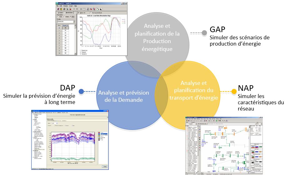 DAP est un logiciel conçu à la fois pour prévoir la demande et la pointe de charge et pour préparer des actions de Maîtrise de la Demande d’Électricité (MDE). DAP comporte quatre types de prévisions : simple (Simple trend forecast) ; sectorielle (Sector trend forecast) ; consumériste (Customer trend forecast) ; MDE (DSM forecast).
